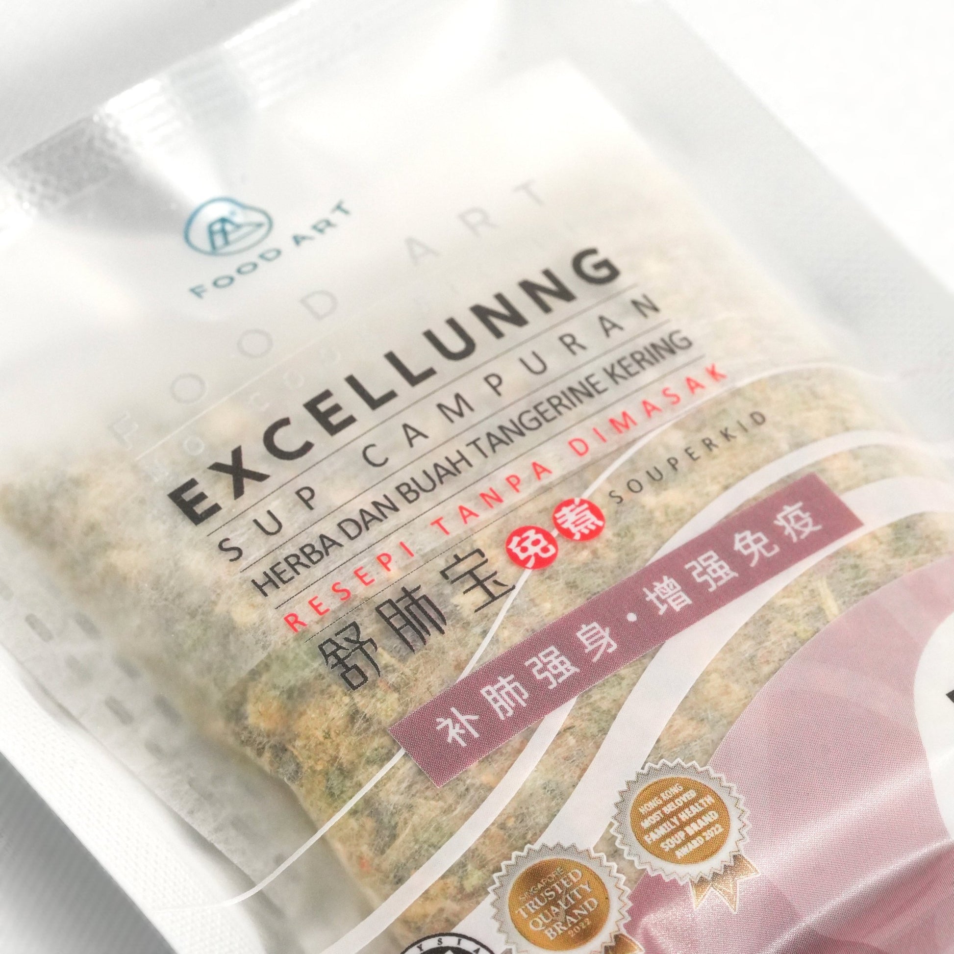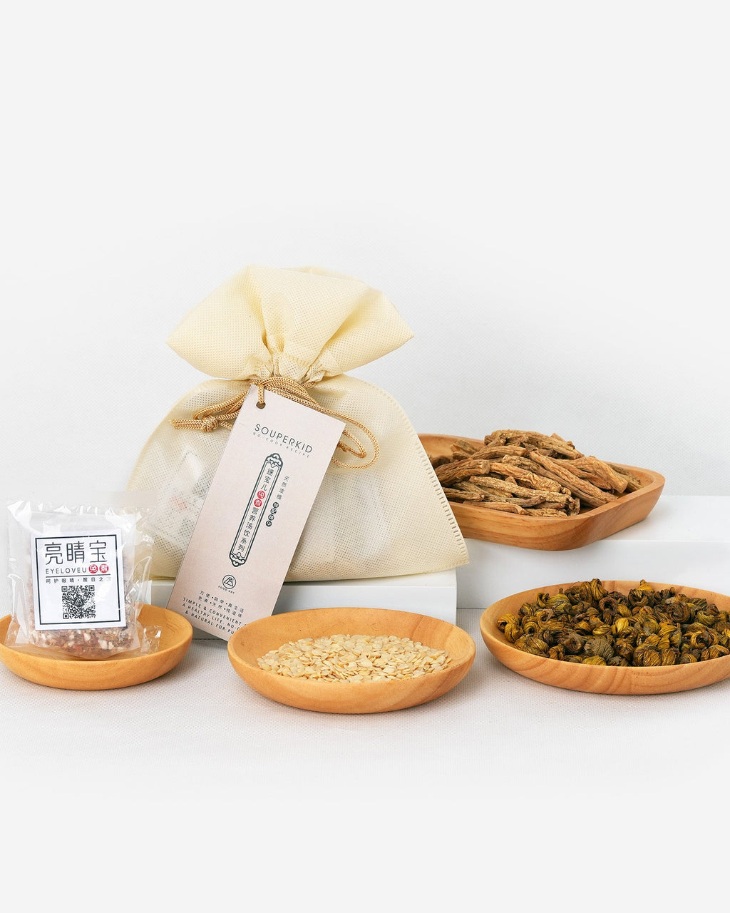 Bahan-bahan: Keladi Cina, Kurma Merah, Goji, Codonopis, Longan Kering, Poria Cocos, Lobak Merah Dehidrasi, Perencah Sayuran, Dendrobium Nobile dan Nux Prinsepiae.